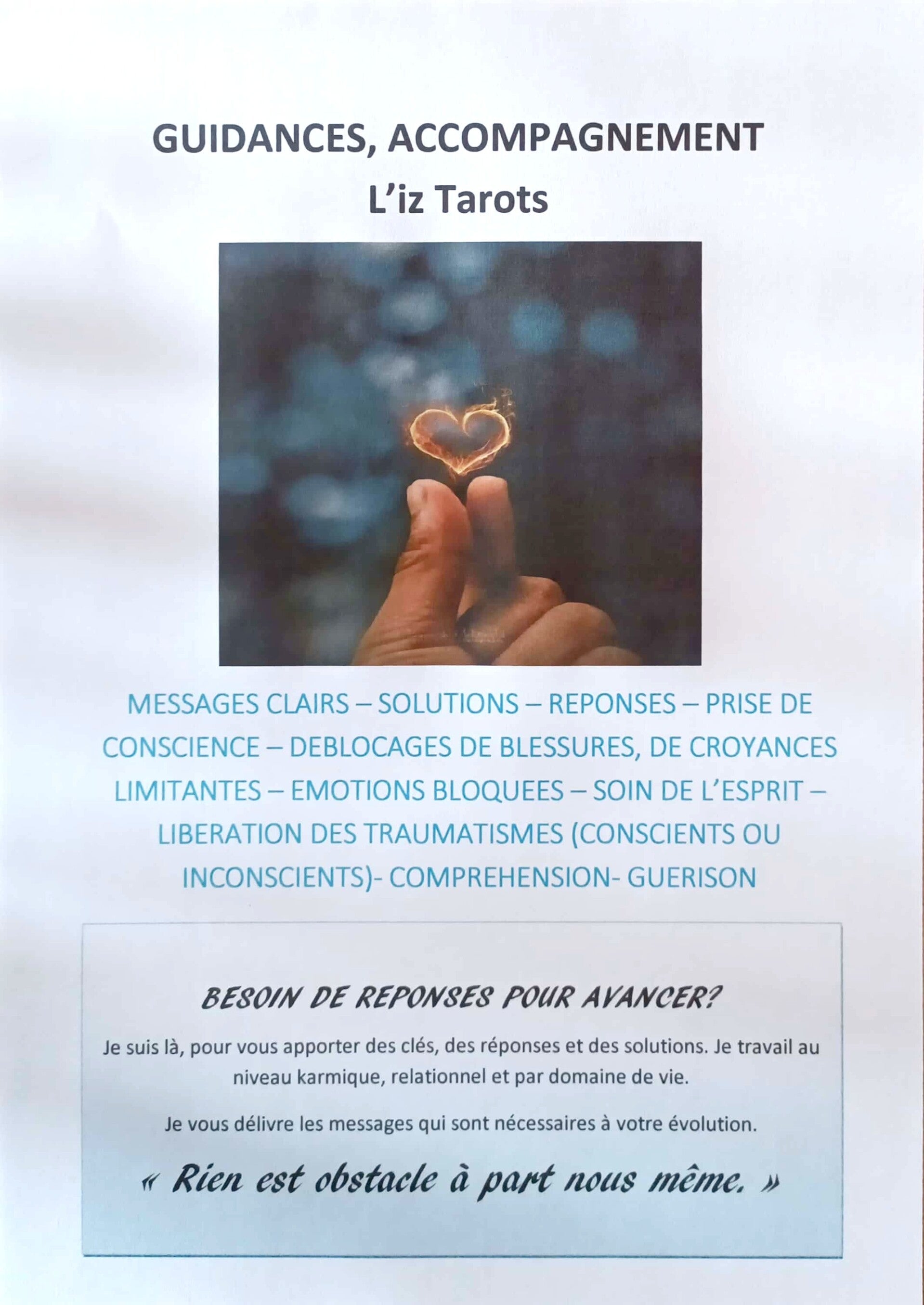 Le bien être passe par l'exploration intérieure afin de trouver les clés de nos ressources, pour avancer, débloquer les choses, et en comprendre le sens. L'iz Tarots
